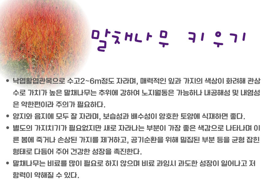 | 상품설명 | 독특한 색감으로 정원의 포인트을 주기에 좋다. 특징 - 녹색의 가지가 노란색으로 변하며 점차 윗가지로 갈수록 붉은색을 띤다. - 다른 말채나무와 다르게 흰색의 꽃이 점차 검은색으로 익는다. 활용 : 정원수, 공원수 등 포인트조경으로 적합하다. |