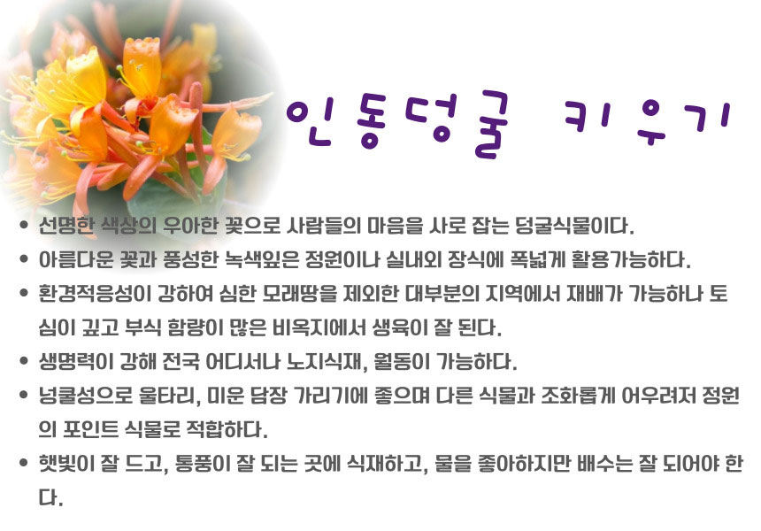 | 상품설명 | 꽃잎 테두리는 진하고 중심부는 밝은 투톤으로 작은 꽃 안에 흰색 꽃술을 볼 수 있다. 개화: 6~9월 특징 : 붉은색의 작은 꽃은 넝쿨이 올라가는 지주형태에 따라 다양하고 화려한 모습을 관상할 수 있다. 그늘진 곳에서 잘 자라고, 생장속도가 빠르다. 활용 : 기둥형, 아치형, 울타리형 등 다양한 모양으로 키우는게 가능하다. |